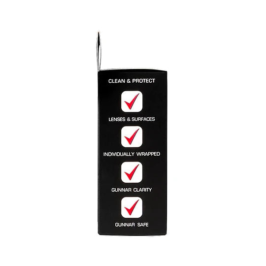 Keep your Gunnar glasses and digital devices spotless with Gunnar Wipes. Each box contains 30 individually wrapped wipes, ideal for your daily adventures. Discover the clear choice for efficient screen and lens cleaning.